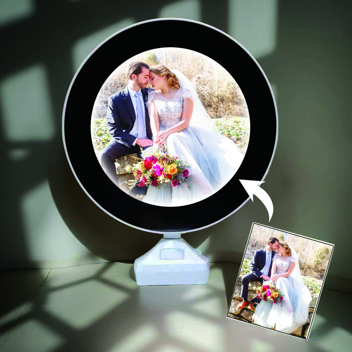 Function: Works as a mirror until you press the button โ then your personalized photo lights up